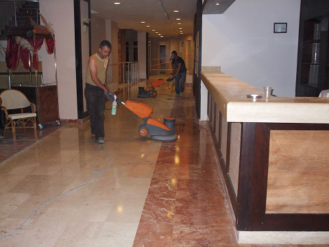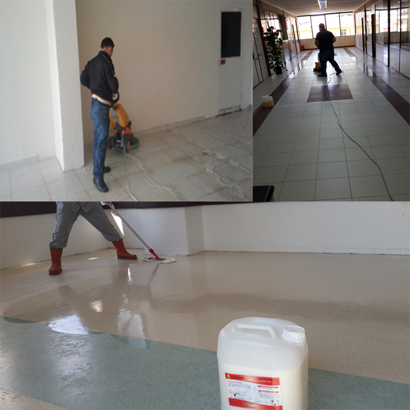 Yer yıkama makinesi ile zemin yıkanır ve kurutulur. Daha sonra mop yardımıyla silinir.